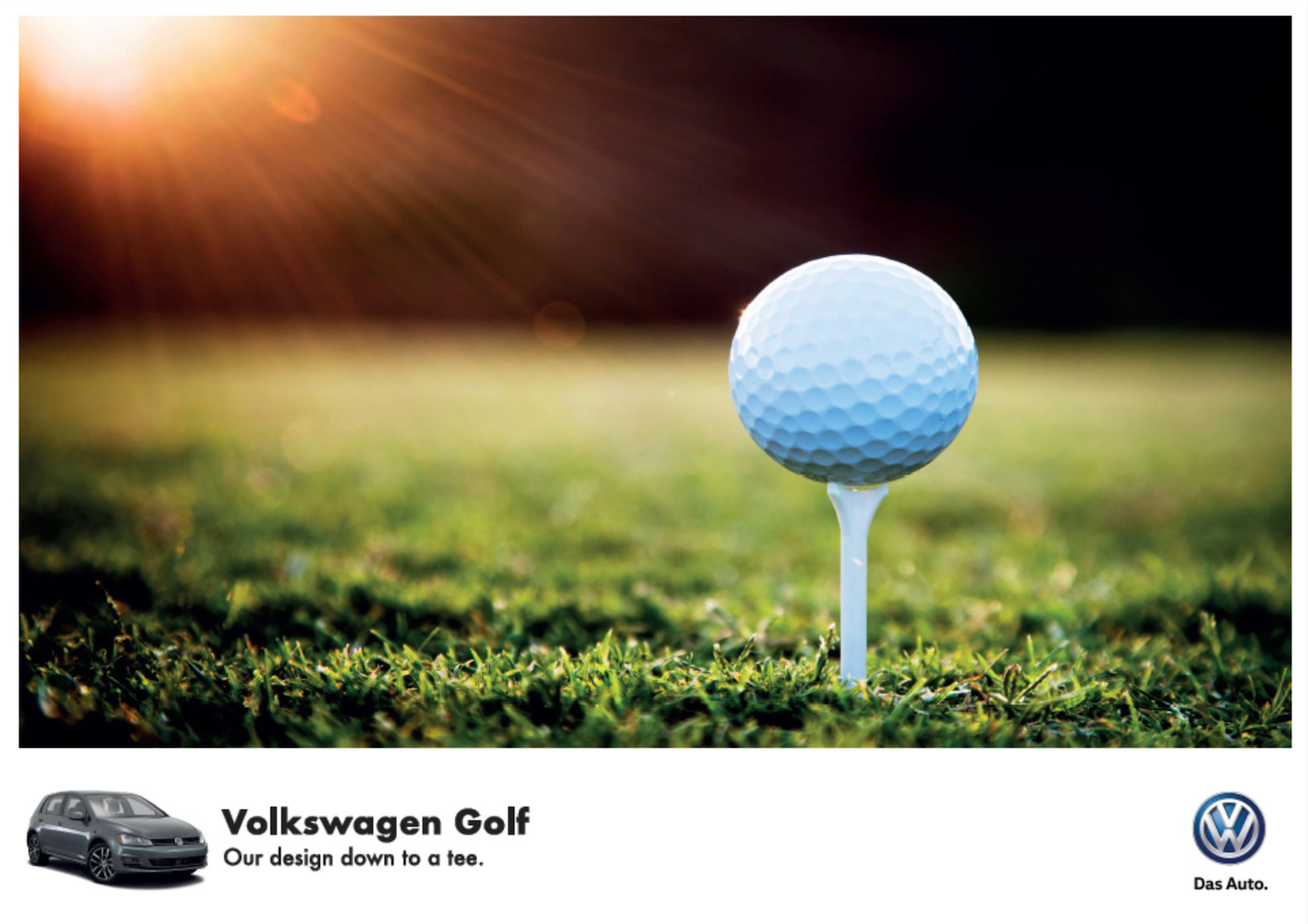 We decided to create out advertisement for the VW Golf, using an image of a golf ball on tee, with the strap-line "Our design down to a tee." We felt that this idea played on the name linking it to the sport, using the strap-line conveyed the message that VW and golf were a strong brand and product, linking the strap-line and design back to the sports theme.
